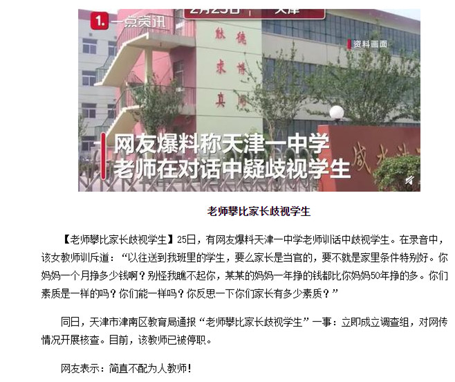 天津一老师攀比家长歧视学生,通报来了
