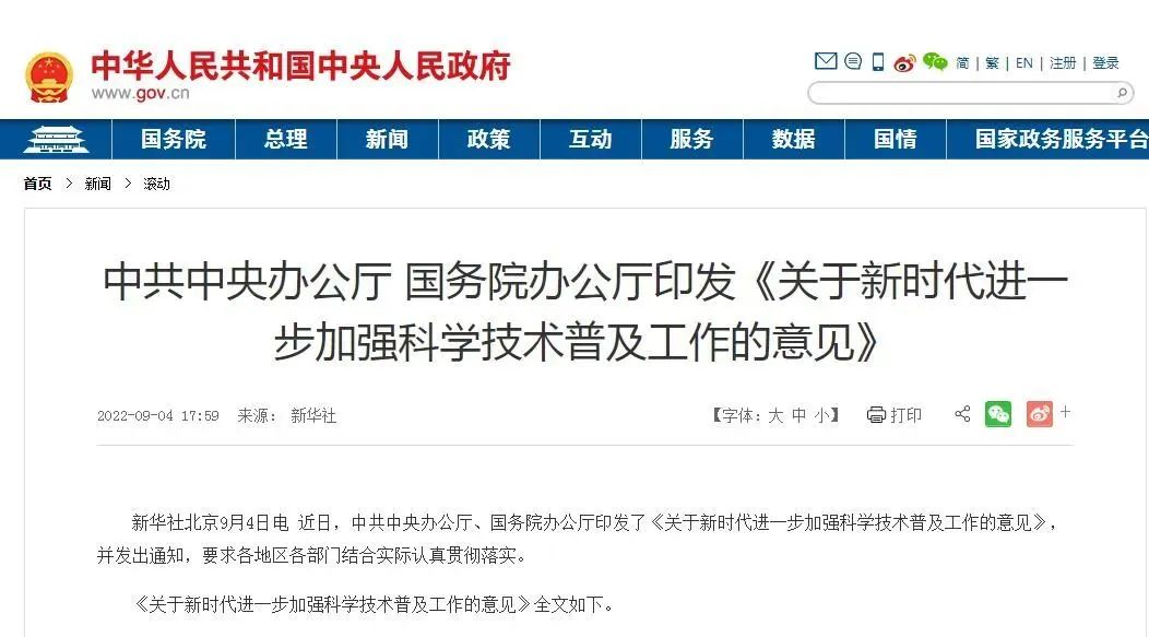 近日,中共中央办公厅、国务院办公厅印发《关于新时代进一步加强科学技术普及工作的意见》(以下简称《意见》),要求坚持把科学普及放在与科技创新同等重要的位置,推动科普全面融入经济、政治、文化、社会、生态文明建设。