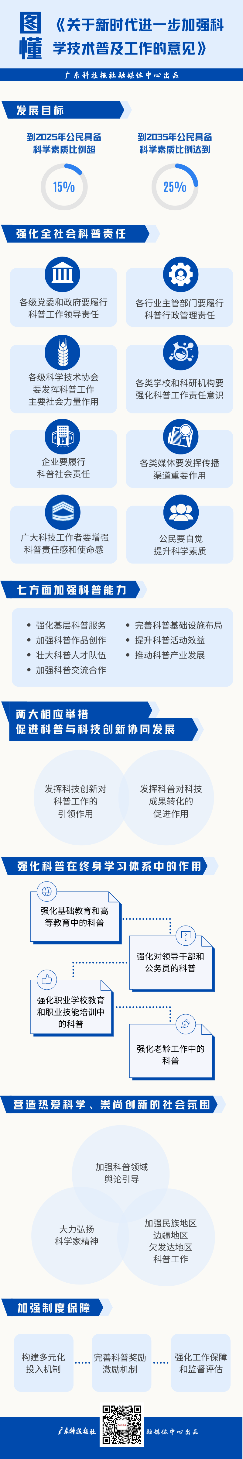 提出了落实同等重要的工作思路、制度安排和政策措施,特别注重强调加强制度保障,要求各级党委政府要保障对科普工作的投入。完善科普奖励激励机制,加强科普工作的监督和评估,要求完善科普的法律法规体系,积极推动修订《中华人民共和国科学技术普及法》。