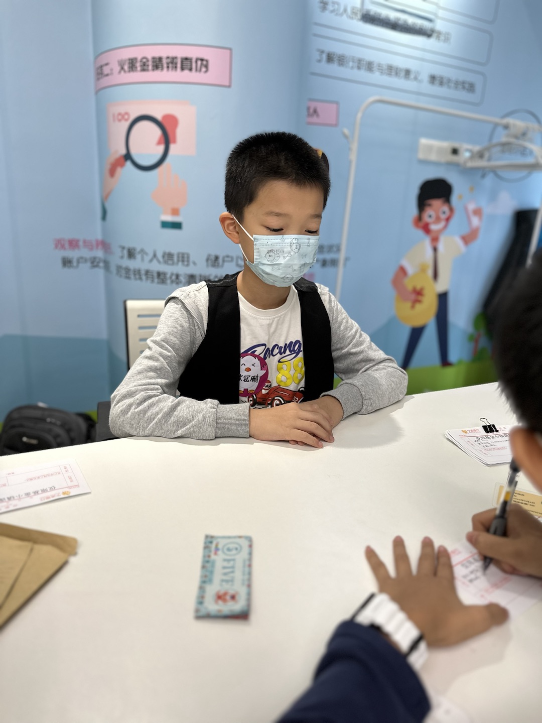 在赚取第一桶金,结算各自资产,并进行经验分享后,小朋友们开始了资金储蓄的体验环节。通过点钞学习和点钞比赛、柜员与客户的角色扮演,小朋友们分别体验了柜员工作及银行储蓄流程,储存了个人资产,更深刻地理解了储蓄的含义及银行等金融机构的相关工作。