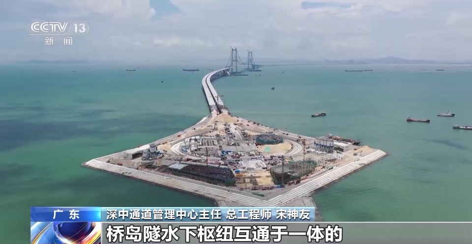 深中通道管理中心主任、总工程师宋神友:未来,珠江西岸的人跟深圳机场以及前海实现快速交通转换,就是通过在东岸设置了一个高速公路水下枢纽互通立交的形式,所以最终这个项目就是采用了桥岛隧水下枢纽互通于一体的跨海集群工程。