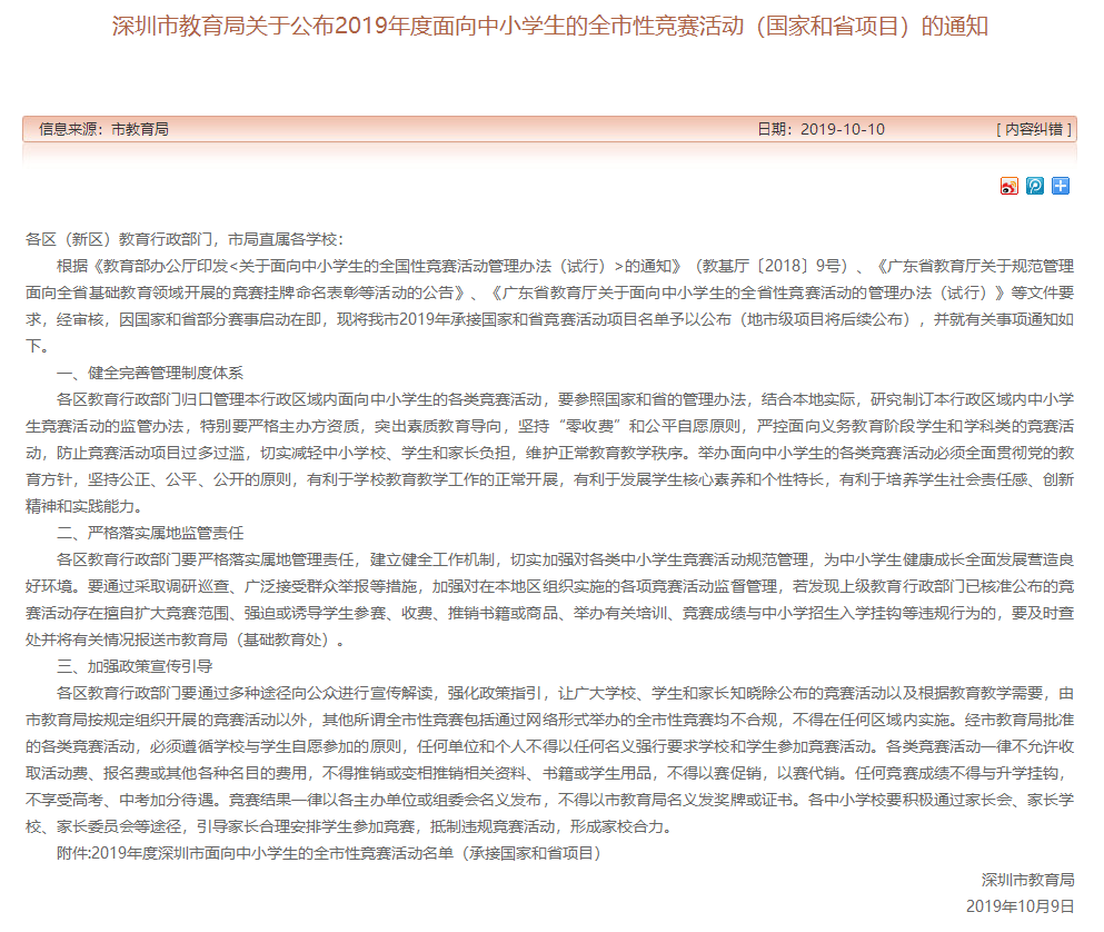 2019年度深圳市面向中小学生的全市性竞赛活动名单(承接国家和省项目)