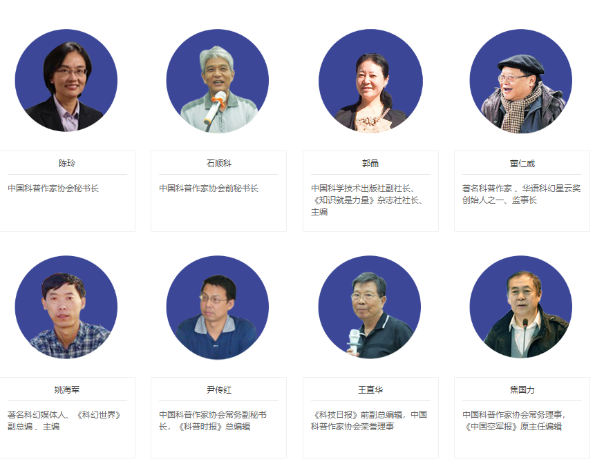 专家评审委员会负责大赛作品评审工作,由具有高级专业技术职称、学科(行业)内的权威专家学者和科普领域内高水平的科普作家、科幻作家、理论家、评论家、编辑家、翻译家和组织工作者担任。