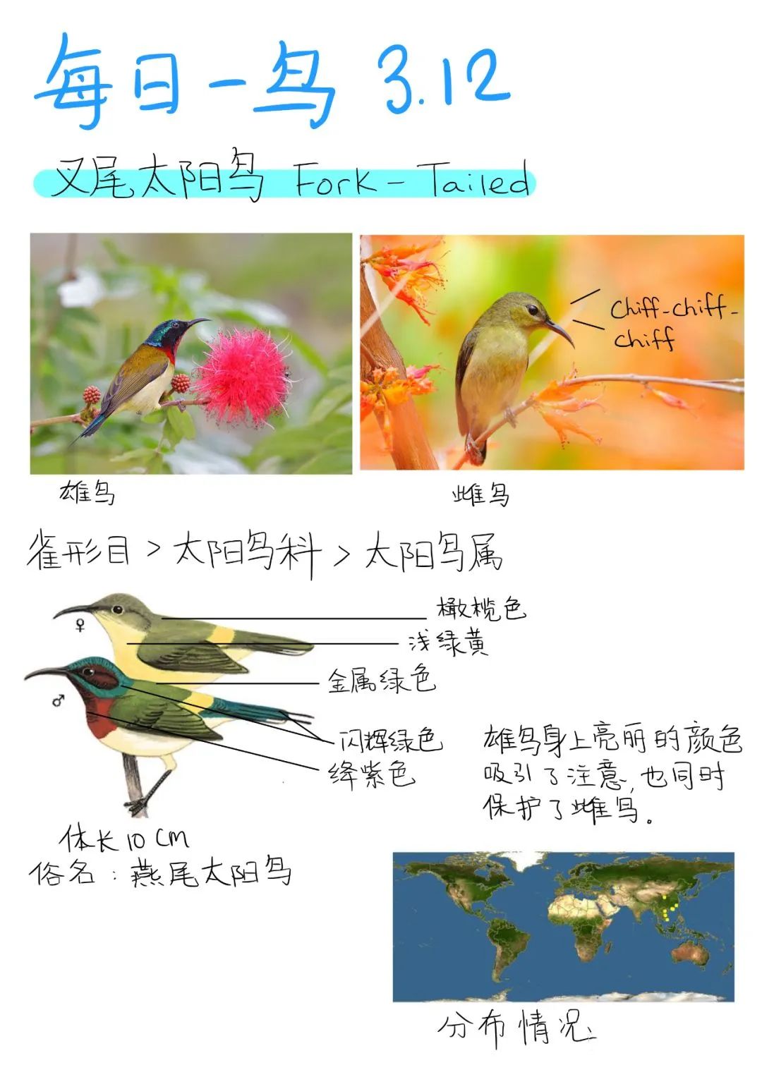 大家好!我是王雨迪,今天要科普的是叉尾太阳鸟。它们是深圳的留鸟,经常出没在深圳湾公园。雄性太阳鸟和雌性太阳鸟有着完全不同的颜色。这种颜色的差别是雄鸟要保护雌鸟的体现。这些好看的图片都是舅舅不停的追踪叉尾太阳鸟时拍下的。