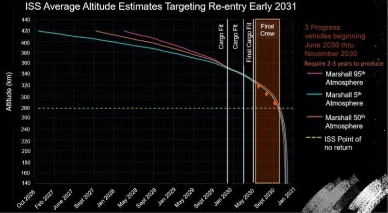 除此之外,国际空间站位于地球大气脆弱的上层区域,处于近地轨道上。如果没有周期性的助推力,之后的运行速度会越来越慢,高度也会越来越低,最终下降得足够深之后,便会解体穿过大气层,焚烧殆尽。
