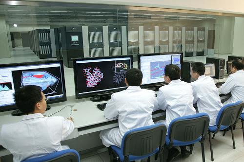 正在对“天河一号”超级计算机进行系统性能测试的科研人员(来源:新华社)