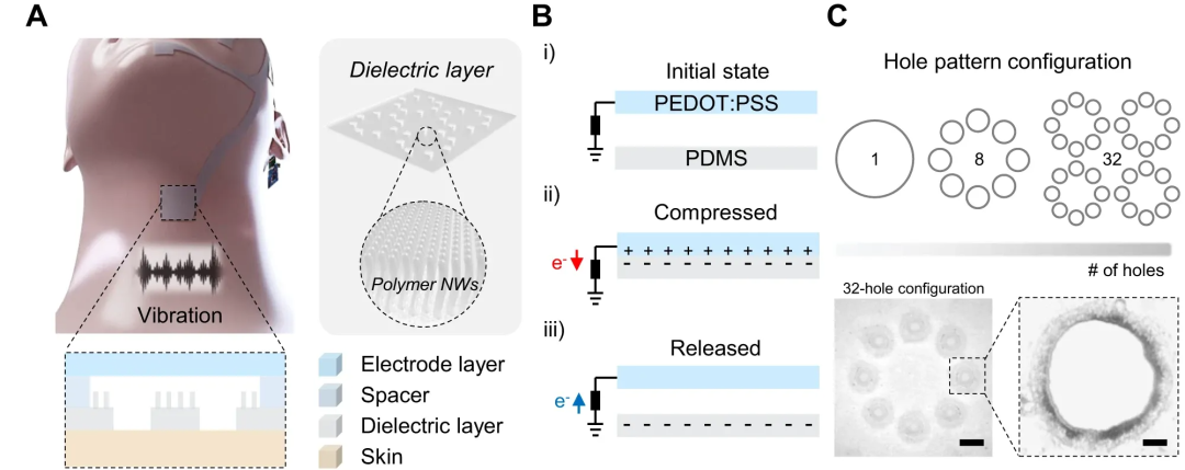 图|振动传感单元的工作机制和表征。A. 振动传感单元的示意图。插图:检测声带振动的传感单元的放大视图。B. 工作循环期间传感单元的电势分布。C. 用于声音振动传感器的孔图案配置示意图以及 32 孔配置中孔的 SEM 图像。比例尺:2 mm(插图:显示声孔的放大视图。比例尺:400 μm)。