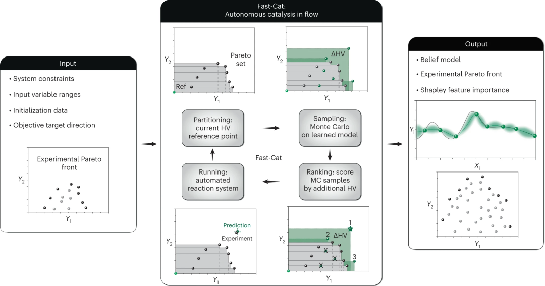图|Fast-Cat 工作流程概述。输入:先前数据、约束条件和优化目标。循环:确定当前超体积(HV),蒙特卡洛(MC)在新点对 ML 模型进行采样,根据预测获得的超体积对点进行排名(点 1 处的绿色星表示 HV 改进最大的预测,然后是点 2 和3 按顺序),对最佳预测进行实验并重复。输出:最新的替代模型(曲面图和特征分析)和实验数据点(帕累托前沿)。