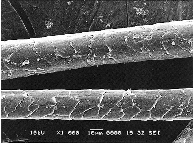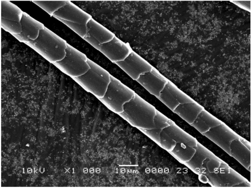 可以看到,山羊绒纤维表面长有鳞片,绒毛上被环状鳞片所围绕;鳞片边缘纤细而清晰,紧贴毛干,与毛干的倾斜角度小;鳞片表面平而光滑;鳞片暴露部分大,因而鳞片密度小。
