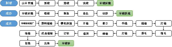 一件羊绒衫的重量通常约为 200~400 克,虽然薄薄一件,但是羊绒衫的制作过程非常繁琐,从最初的山羊养殖、取绒开始,每一步都需要精细的操作和高度的专业知识,主要有制绒、纺纱、织造成衣等流程,一般都需要由产业链上下游的不同企业来完成。每一道流程又包含多道工艺步骤,最终才能成品。