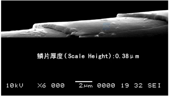 山羊绒纤维表面的鳞片结构和鳞片厚度(0.38 微米)图片来源:GB/T 14593-2008, 山羊绒、绵羊毛及其混合纤维定量分析方法、扫描电镜法[S].