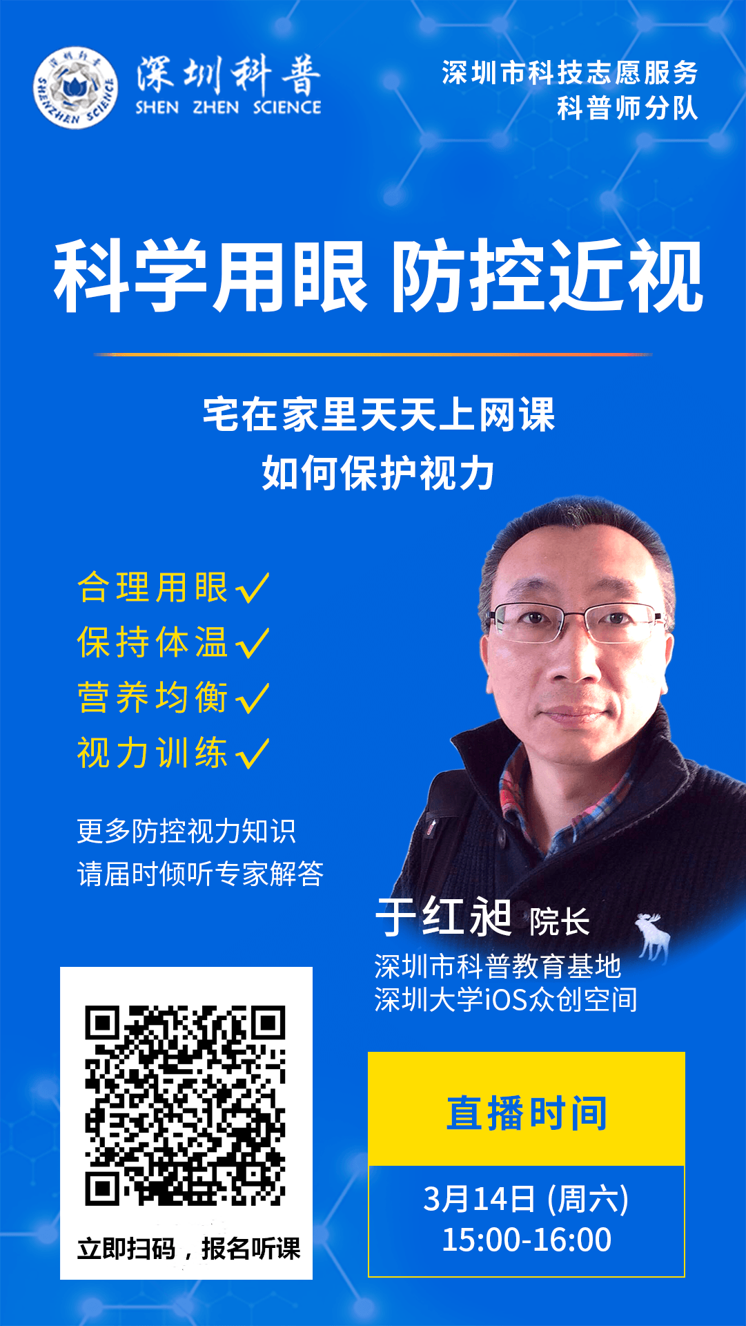 这个周末,深圳市科普教育基地联合会的会员单位——深圳大学IOS众创空间于红昶院长,来给大家在线讲解如何“科学用眼,防控近视”。从2月中旬开始,于红昶院长已经受邀为几十所中小学的网课,做了讲座哦~