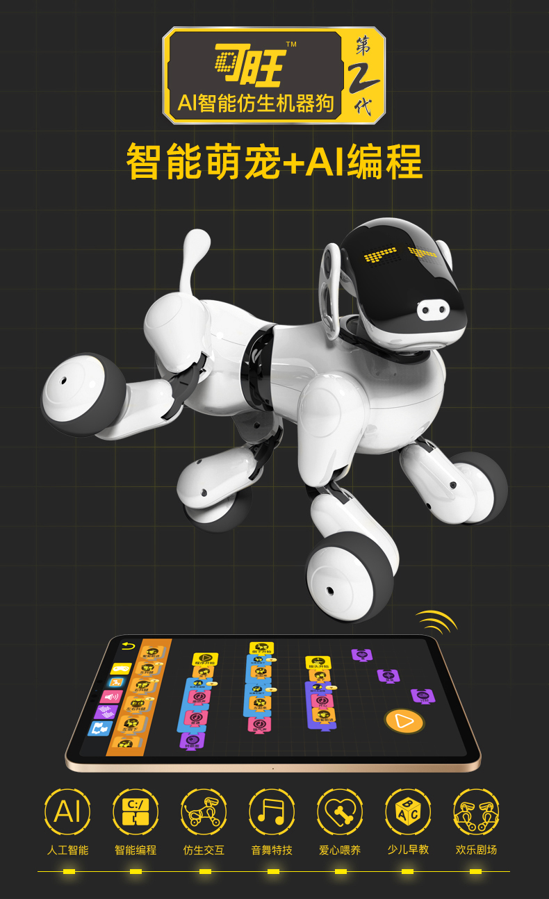 是一款搭载了尖端人工智能与舵机技术的仿生机器狗,它能识别语音指令,快速完成仿生动作并表达自己的喜怒哀乐;通过App控制,还可以进行智能编程、爱心喂养、开心遛猪、音舞特技、多机表演等功能互动。