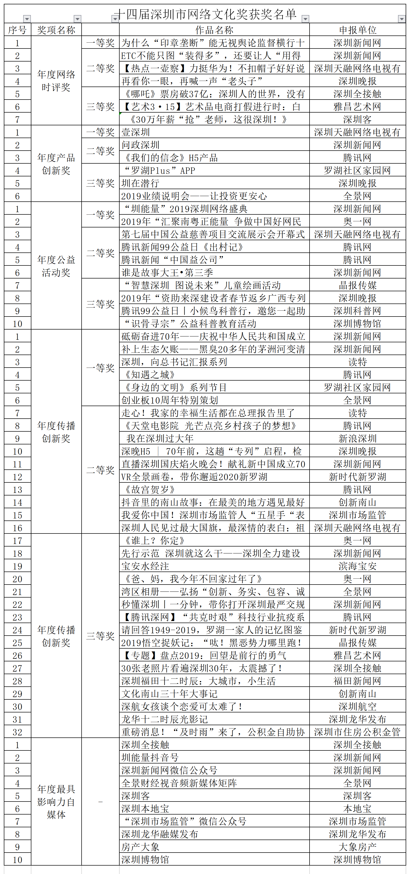 附件:以下为第十四届深圳市网络文化奖获奖名单
