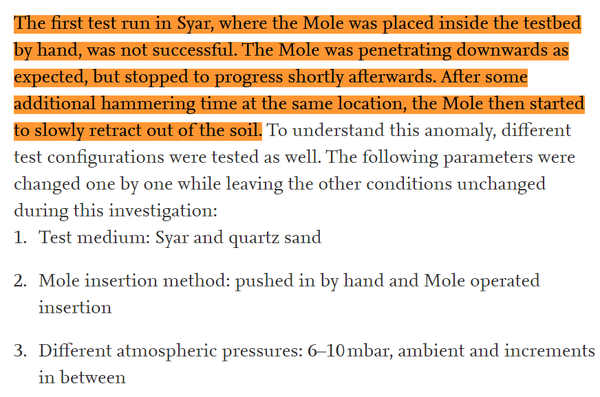 地面测试时已经发现,当选择了有一定粘聚力的玄武岩模拟物土壤(Syar)时:“ “鼹鼠”下钻并不成功,它按预期向下钻,但不久就停止了前进。在同一地点增加了锤击时长后,"鼹鼠"开始慢慢地从土壤中缩回。”