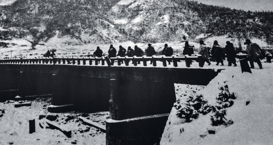 志愿军第9兵团战士通过长津湖大桥。长津湖是朝鲜北部地区最大的湖泊,海拔在1300米以上,位于赴战岭山脉与狼林山脉之间。长津湖地区一般从10月份开始进入冬季,11月开始温度一般可达零下3.6度,1950年冬季由于受西伯利亚寒流影响,当地温度骤降到零下30度以下