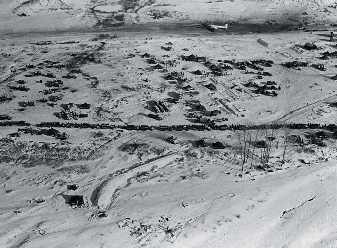 1950年12月,美海军陆战队第1师在长津湖附近下碣隅里的营地,这里驻扎着陆战1师师指挥所和师属特种兵分队,第1团和炮兵11团各1营,图片中一架飞机正在从跑道上起飞,这个简易机场对陆战1师最终逃出生天意义重大