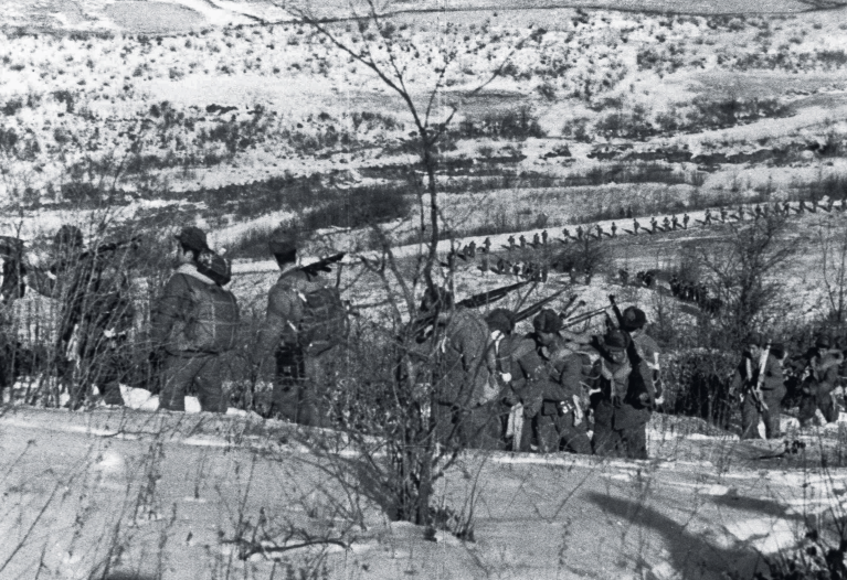 1950年11月,在长津湖附近前行进的志愿军部队。当时20军隐蔽进入柳潭里以西以南;27军主力隐蔽进入柳潭里、新兴里以北 ;而26军主力则由厚昌向战场靠近,开往长津东南地区