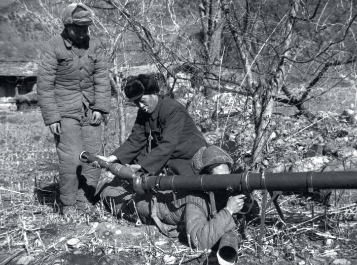 1950 年冬,志愿军第9兵团副司令员陶勇(中)正在查看缴获的美式火箭筒。1950年11月 27日,志愿军第9兵团在极端困难的条件下,在长津湖地区同美军浴血奋战了十余昼夜,歼敌13916人,给予美第10军沉重的打击