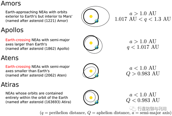 根据近地小行星轨道与地球轨道关系,可以将近地小行星分为Amor型、Apollo型、Aten型和Atira型。
