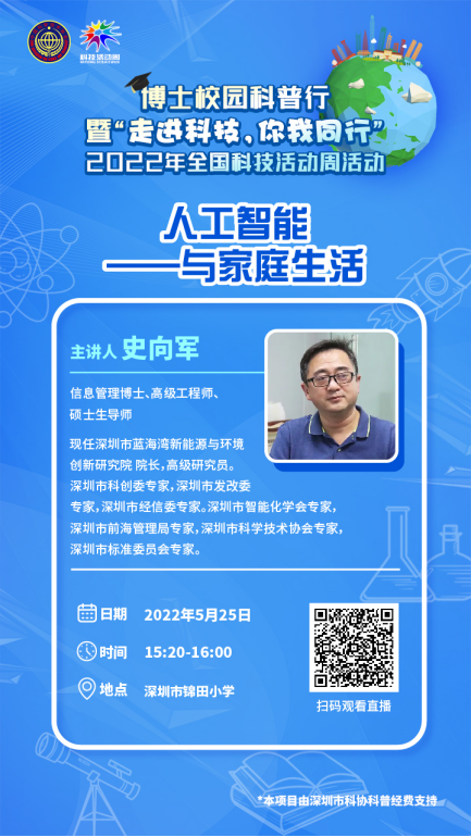 史博士详细讲解了什么是人工智能,人工智能的发展阶段、人工智能和我们的距离及热门技术、未来趋势等内容。同时,史向军博士通过国内外在生活中的应用智能科技案例,从日常居家生活中的做饭、洗碗、扫地机器人到企业互联网中使用的刷脸支付、医疗、搬运机器人,再到学生们经常使用的智能音箱及3D打印等常见机器人,让学生们更加了解人工智能在家庭生活中的应用普及。