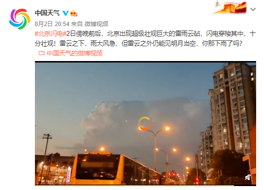 8月2日晚,北京朝阳、房山、延庆、昌平等多区发布了雷电黄色预警,在部分地区上空出现巨大的云中闪电,闪电在云中劈刺,惊心动魄,如同魔幻特技,十分壮观。