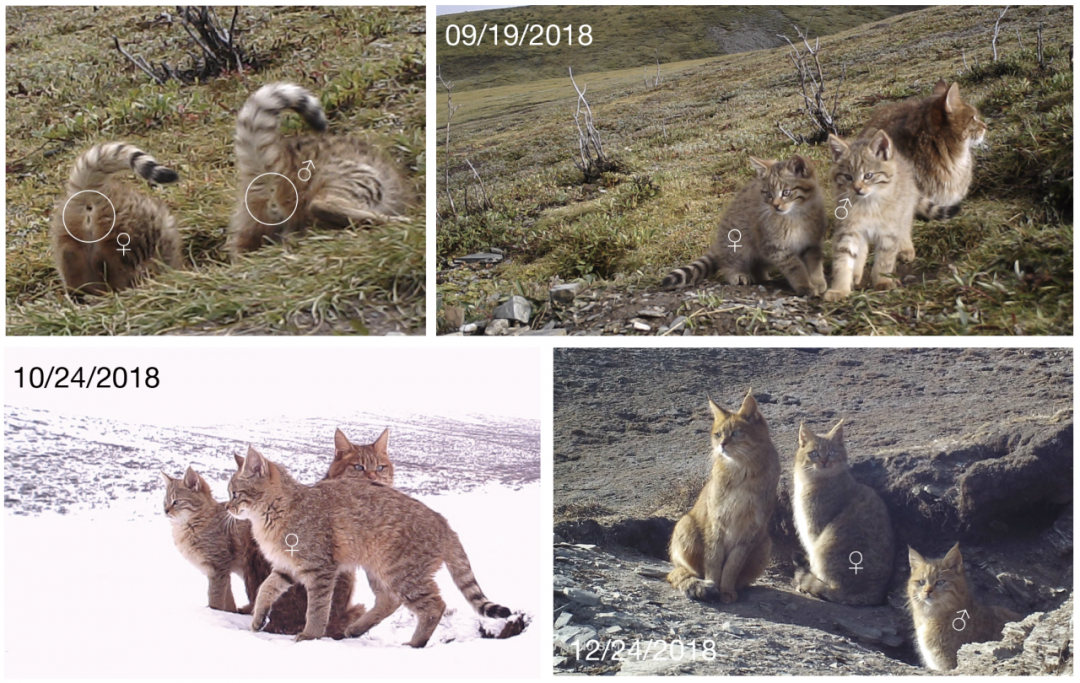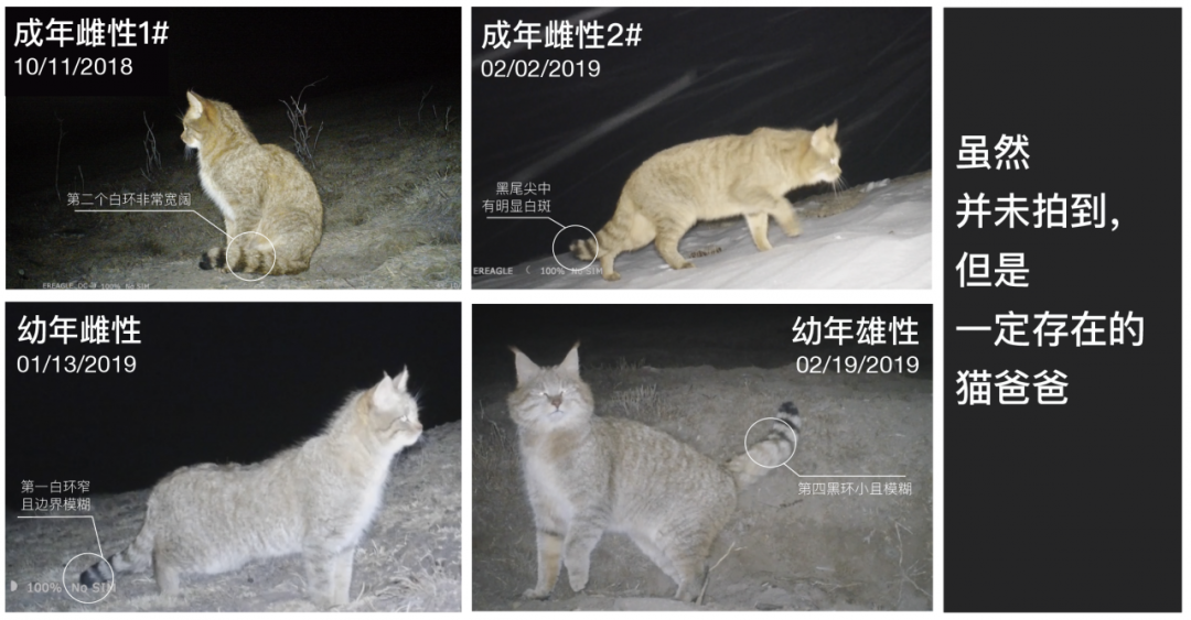 基于荒漠猫尾部独特的黑色环纹与尾端,我们在嘉塘草原确定了至少 5 只荒漠猫个体的存在:繁殖家庭中的成年雌性、雌性幼崽、雄性幼崽、一只其他的成年雌性和从未露面但一定存在的成年雄性。