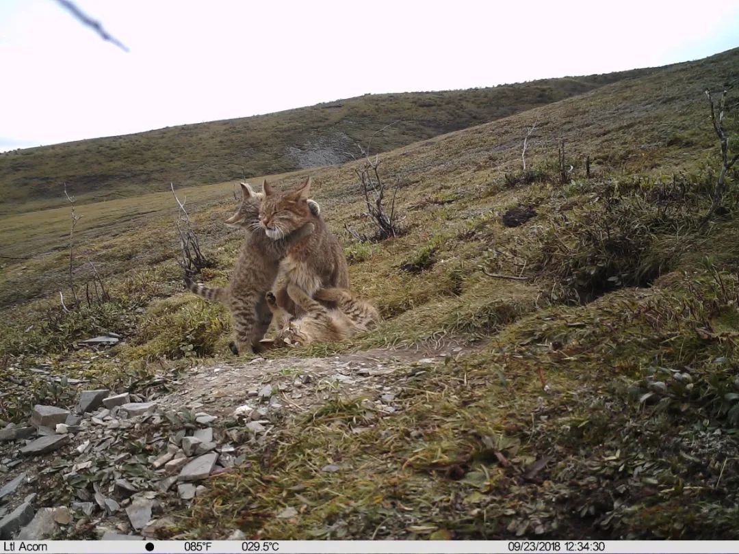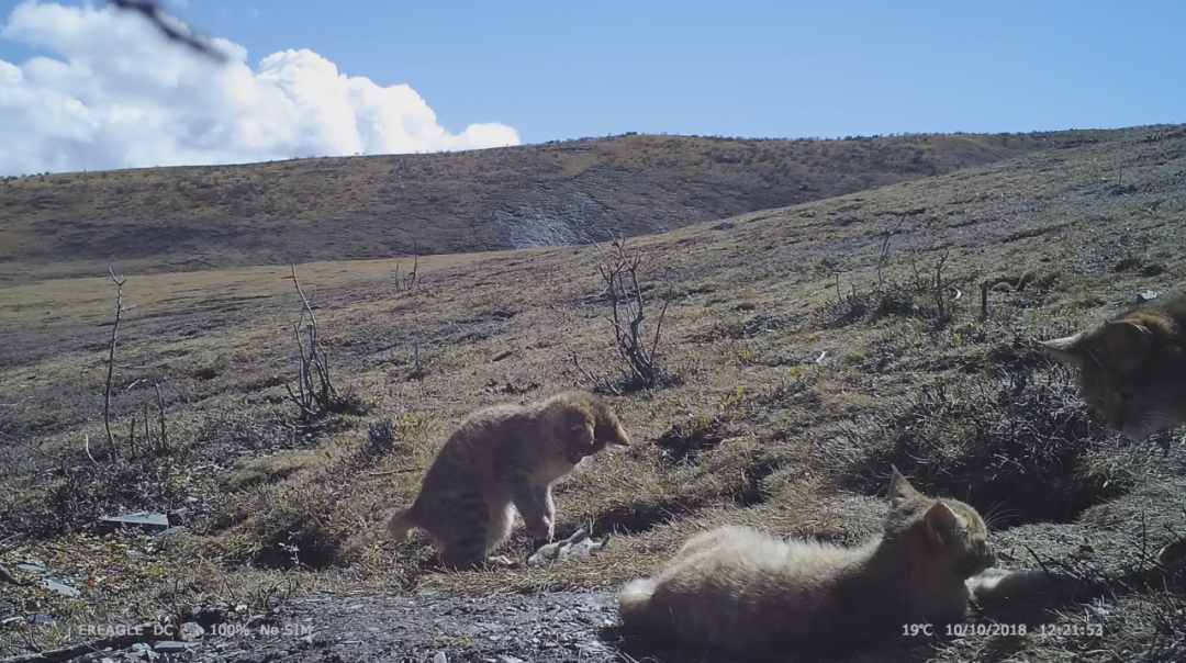 通过红外相机的持续监测,我们得以分辨幼崽的性别,并了解到它们在野外状态下完整的成长过程。2018 年 9 月 19 日,当小猫约四个月大小时,它们的体色相对较浅,而身体上的花纹也更加清晰,尾巴上黑环的数量也较成体更多,有 5 ~ 6 个;2018 年10 月,这时的小猫相比之前颜色明显变深,且耳尖的簇毛也变得更加清晰;2018 年 12 月,当我们再次发现这个家庭时,小猫的体型和体色几乎已经同大猫并无差别,身体上的花纹也变得如成年般若隐若现,尾部也同大猫一样,只留有 3 ~ 4 个清晰的黑环。