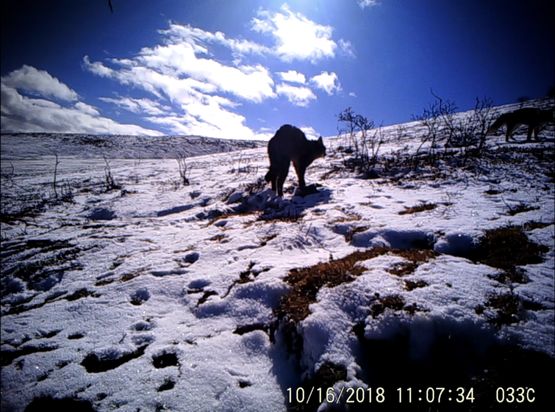 在随后的四个多月里,我们对这一区域内荒漠猫的生存状况进行了调查与监测,最终收获了这一家庭7555 张照片和 2996 段视频;同时,通过在巢周边适栖生境布设的红外相机,我们还获得了另外 29 张照片和 16 段录像。基于它们,我们对几个月以来这一繁殖家庭的变迁进行了梳理。第一个洞穴发现于 2018 年 9 月 16 日,一只大猫和两只小猫在这个洞穴中停留到 10 月 17 日,期间因为未知的原因离开过两次——离开这个洞穴的那天,也是我们最后一次记录到猫妈妈给两只小猫喂奶。随后,这一家庭搬离了第一个洞穴,而经过一周的野外调查,我们在 670 米外的一个坐落在宽阔山谷中的秋季牧场里发现了他们。但是,在这个洞穴发现 4 天后,荒漠猫便随即因为大群牦牛的进驻而又消失不见了。之后,经过将近两个月的寻找,我们的社区监测员在山的另外一边发现了他们。在这之后的第 11 天,2018 年的平安夜,两只小猫离开洞穴外出独立,开始在这片土地上去书写他们自己的故事。