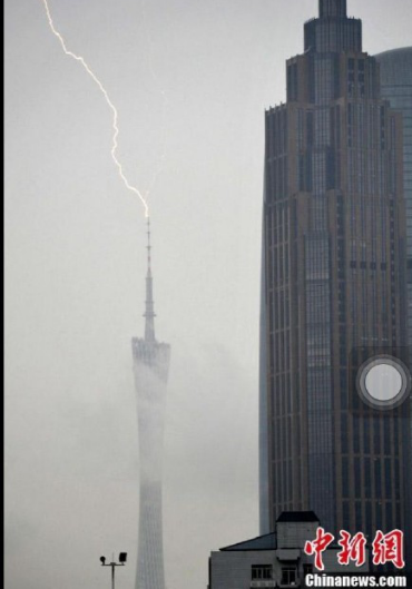 雷电击中广州小蛮腰(图片来源:中新网微博)