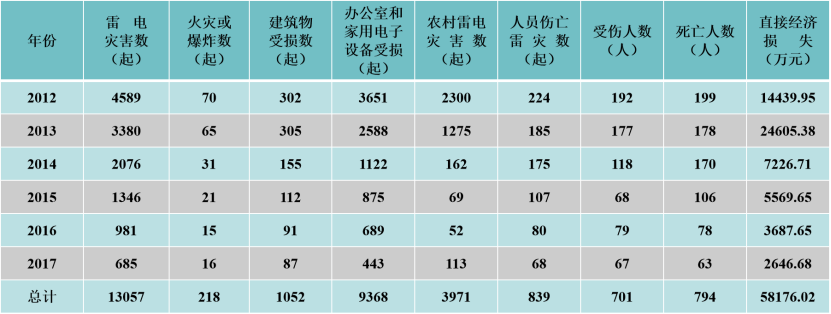 据中国气象局2012年-2017年《全国雷电灾害汇编》不完全统计数据表明:2012-2017年,全国共发生13057起雷电灾害事故,造成直接经济损失高达近6亿元。雷电会引发火灾、爆炸等事故,并造成建筑物、电子设备的损伤。而雷电造成的人员伤亡事故达839起,共造成1495人伤亡。