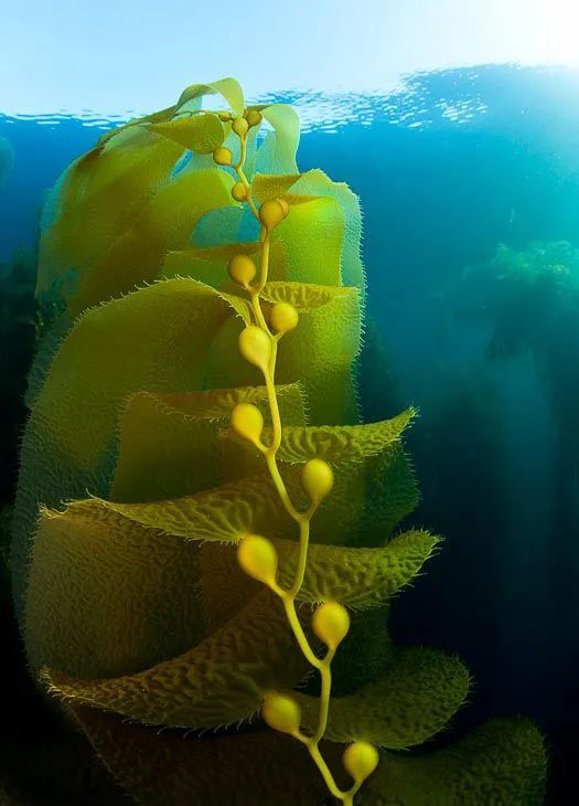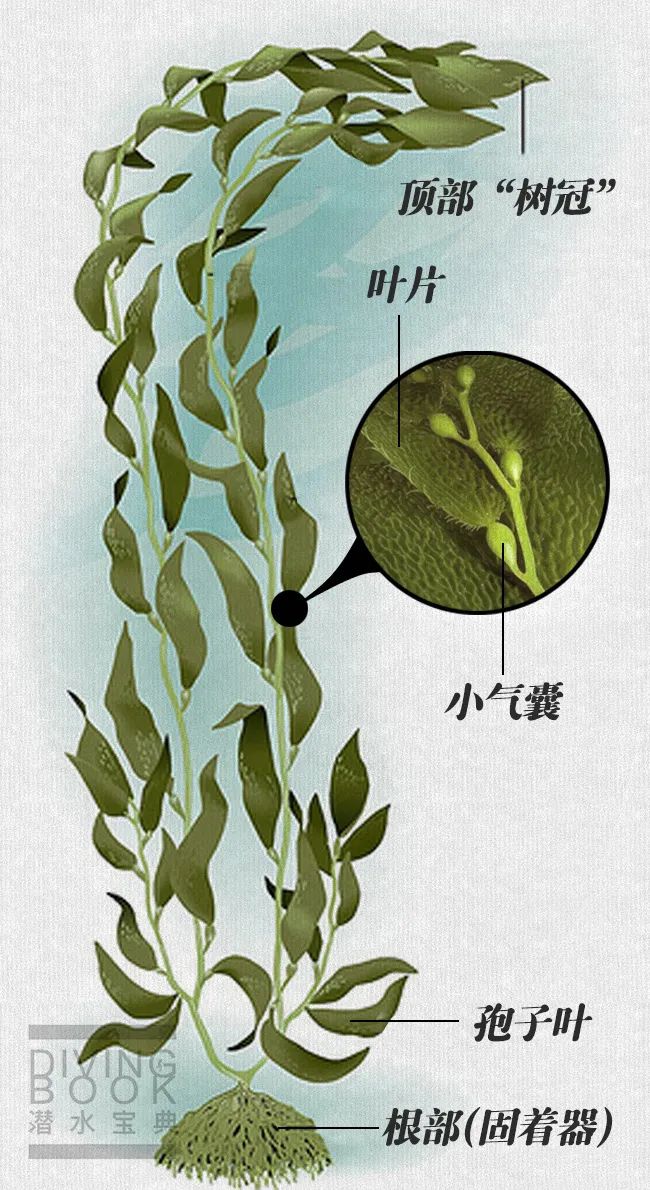 高大茂密的海藻森林主要特征是顶部有明显大型冠状叶片,能够遮蔽大部分阳光,从而水下形成森林的葱郁感。
