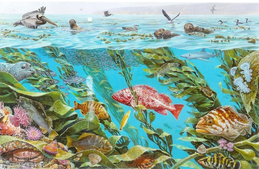 美国曾经发型过的一张邮票,上面记录了加州海藻森林中的生态系统