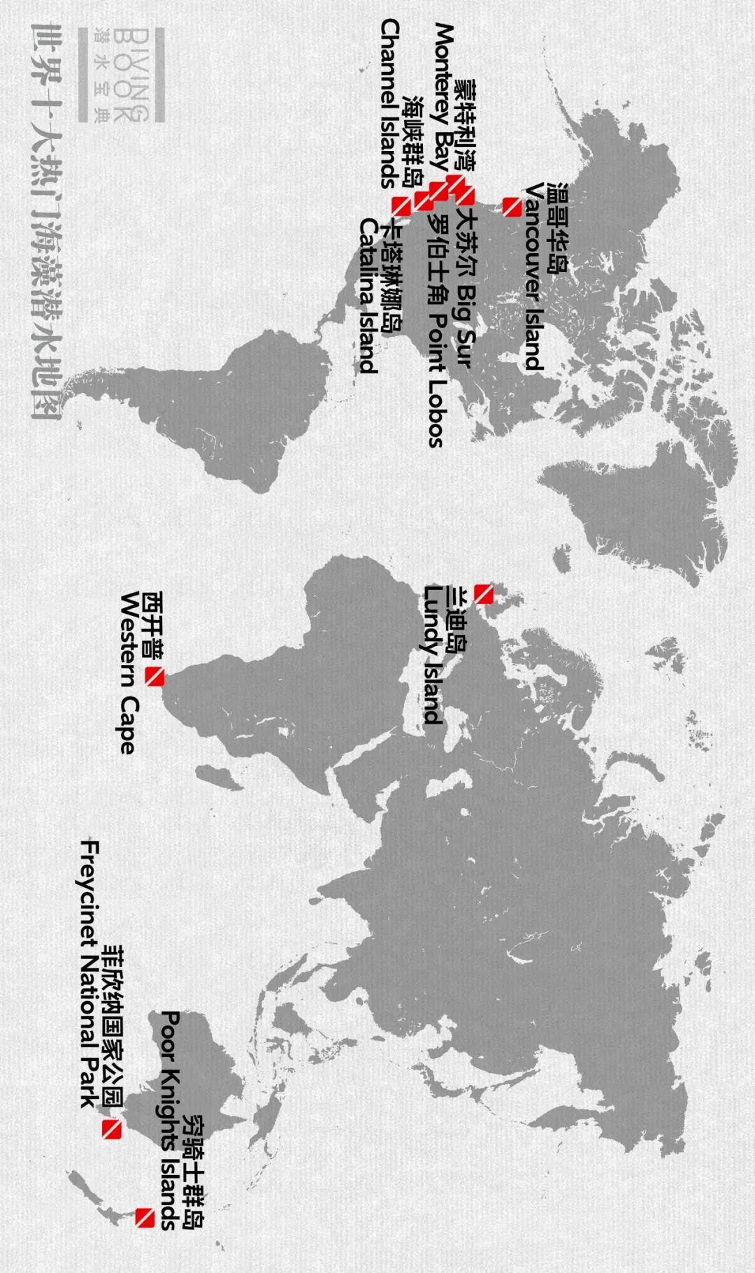 可以说世界上最著名,最典型的海藻森林潜点都分布在加利福尼亚海岸。其中包括卡塔琳娜岛(Catalina Island)、海峡群岛国家海洋保护区(Channel Islands)和蒙特利湾(Monterey Bay), 罗伯士角国家公园(Point Lobos)和 大苏尔海岸(Big Sur)。