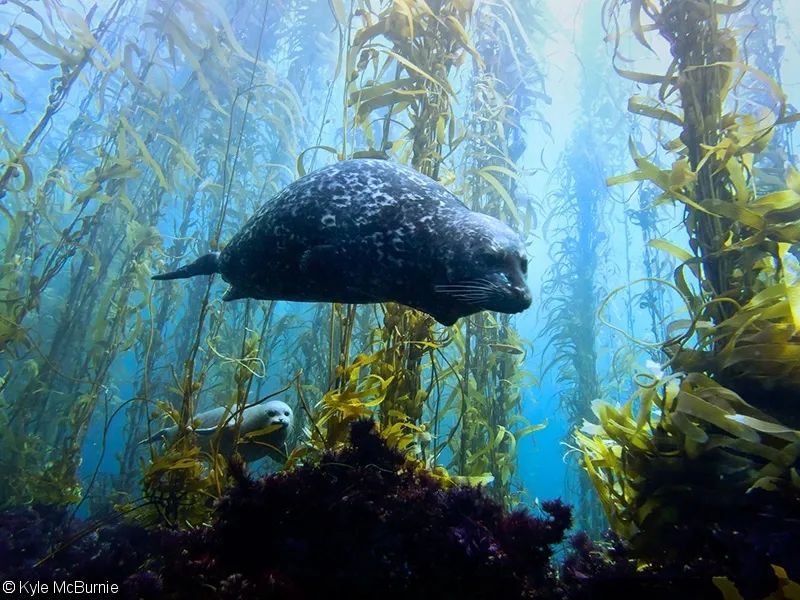这里的水温度常年都在5~10摄氏度,大部分地方海藻都在20米以上,有的甚至可以达到60米高。除了本身令人惊叹海藻之外,还可以看到太平洋港湾海豹、黑鲈、海獭、加州小宏宇(Garibaldi)和大量五颜六色的海星和海葵,大概这里是最适合拍摄海藻森林的区域。
