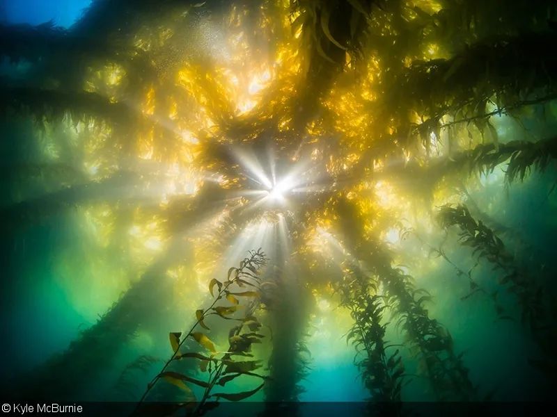 金色的光芒是所有海藻森林摄影师的最爱效果,由于海藻都直耸水面,顶部都有巨大的叶子作为遮蔽光线,这时通常为蓝色的水下光透过绿色的叶子,会变成金色的惊人效果。