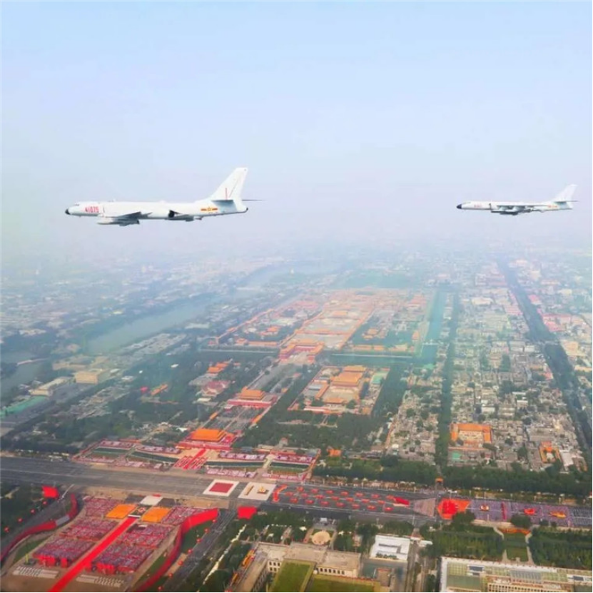 首先登场的是空军航空兵。空军航空兵是航空兵里当仁不让的龙头老大,主要家庭成员很多,有歼击航空兵、强击航空兵、歼击轰炸航空兵、轰炸航空兵、侦察航空兵、运输航空兵,以及军中预警、电子对抗、空中加油等专业航空兵部队。这些赫赫有名的航空兵部队,主要是根据装备的作战飞机种类和使命任务的来划分和命名的。如歼击航空兵是指以歼击机为基本装备,主要进行空中截击、空中格斗任务的航空兵,也被人戏称为“空中刺客”。我军装备歼-10和歼-20歼击机的空军部队就是典型的歼击航空兵。庆祝新中国成立70周年阅兵式上,轰炸机梯队飞临天安门广场上空接受检阅(图片来源:国防部网)