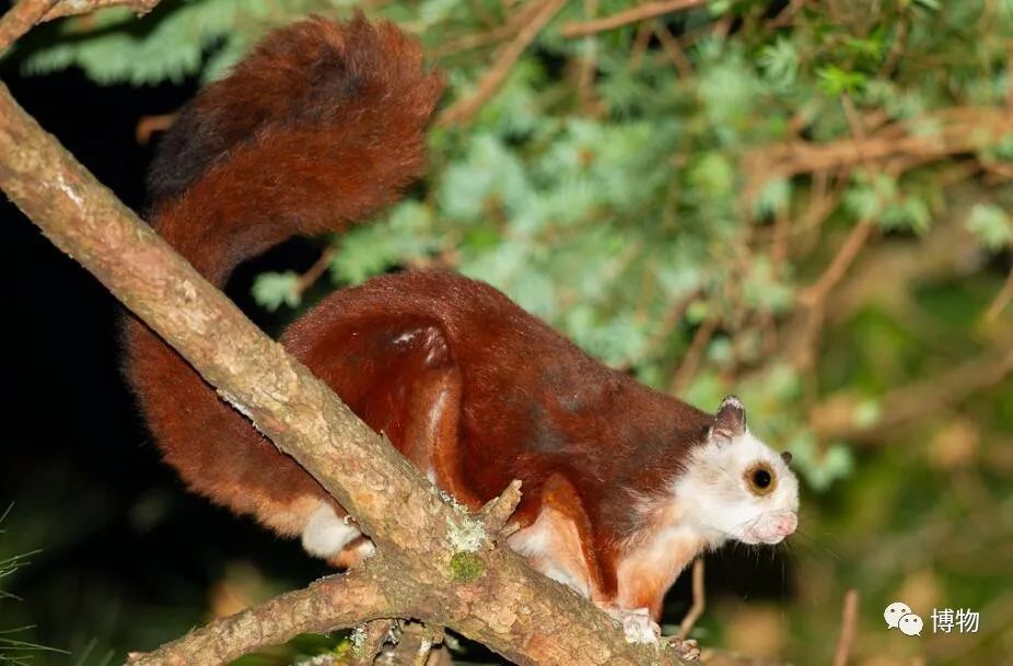 它头身长可超过50厘米,尾巴几乎等长,以啮齿类标准绝对算大个子。头颈和腹部奶白、身上棕红的配色,猛一看又有点像赤狐。想象一下它在山林中攀援跳跃的身姿,说是“飞狐”也毫不过分。