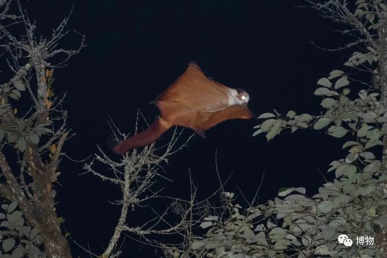 突然,手电光柱照亮了一对光点,随即我们看到一个身影在枝头窜来窜去,光柱几乎跟不上它。当它爬到一根树枝尽头时,我连忙抄起望远镜,心想“这下你没地方跑了吧”,可紧接着就被打脸:只见它凌空跳起,展开四肢,仿佛撑开了滑翔翼,忽忽悠悠落在对面矮树上,蹦跳着消失在夜色中……