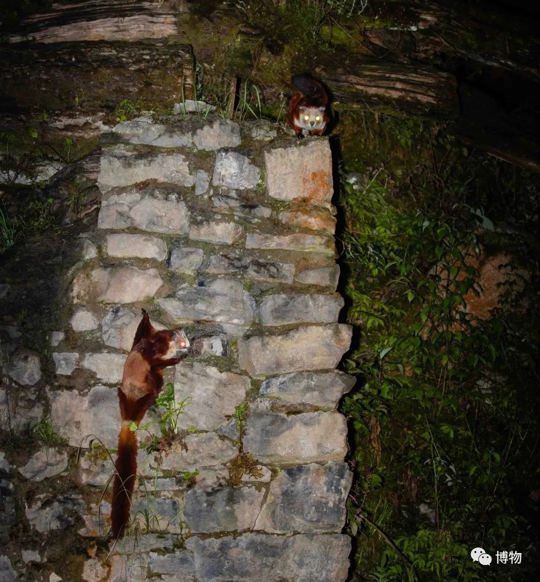 而且,红白鼯鼠喜欢在岩石表面舔食盐分,有时也会在人工建筑上舔盐。下图这两只红白鼯鼠,就是趁着夜色,来到一堵废弃多年的工地石墙,补充矿物质。