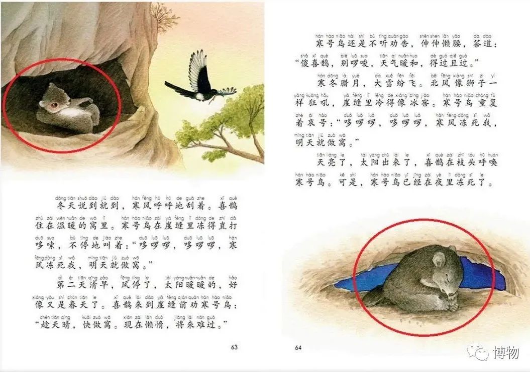 新版教材里的“寒号鸟”配图,是一只类似松鼠的动物。