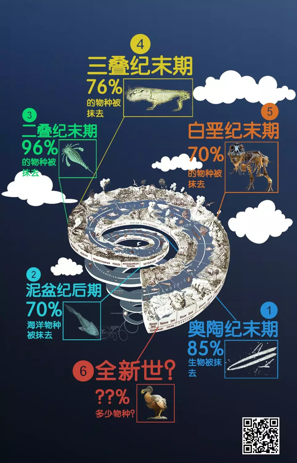 五次主要的大灭绝事件。更多介绍可见《生命史上的至暗时刻》《最大规模灭绝事件的罪魁祸首》。| 图片设计:岳岳