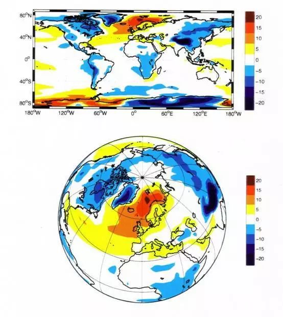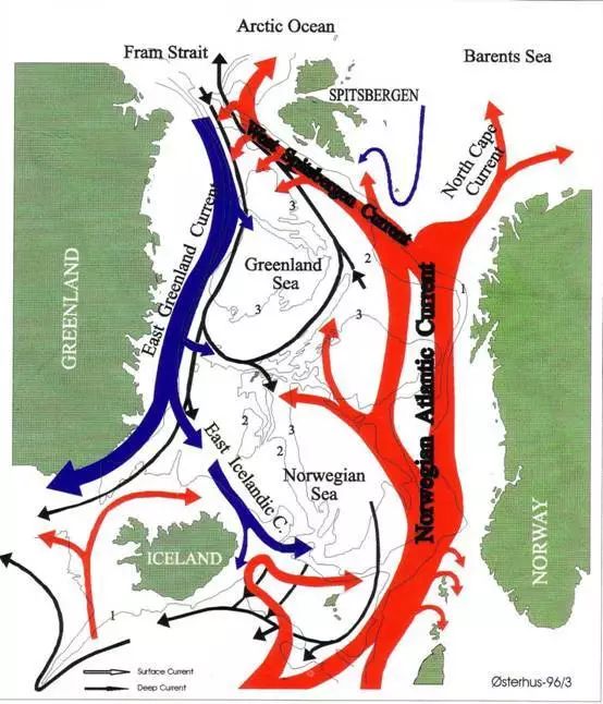 为什么沿挪威海和斯瓦尔巴地区的自然景观如此特殊呢?原来,北大西洋暖流把较低纬度(北纬50度以南)的暖水沿着挪威海自南向北输送,一直到达北纬80度附近。(图片由郜永琪提供) 据海洋大气学家计算,自南向北输送的北大西洋暖流可以使挪威海域上空的大气每年升温约达摄氏20度。从多年平均的北半球地面气温来看,沿斯堪的纳维亚半岛和斯瓦尔巴地区的年平均气温要比同纬度其他地区高5-20摄氏度。