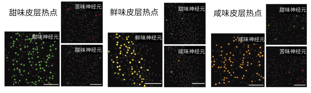 就像下图中的甜味皮层热点区域,遍布了大量被甜味激活的神经元(绿色),但在同一块区域,仅有极少数的神经元会被苦味(红色)和酸味(蓝色)激活。同样,在鲜味皮层热点也鲜有甜味和咸味神经元(橙色)的出现,甜味和苦味神经元也很少出现在咸味皮层热点。