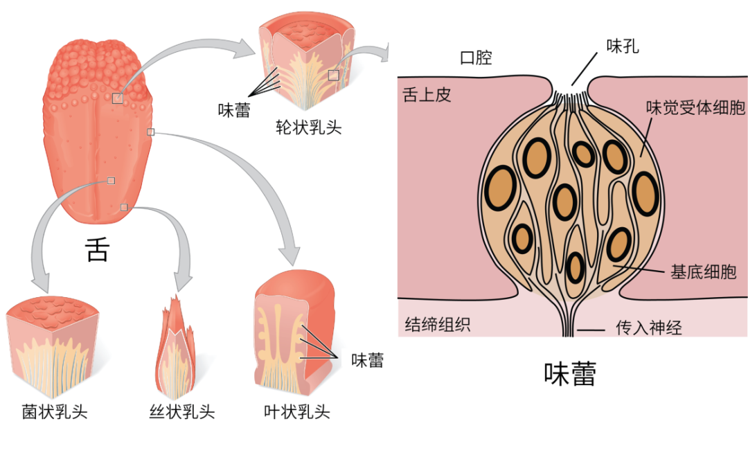 [5]舌乳头图源:By OpenStax https://cnx.org/contents/FPtK1zmh@8.25:fEI3C8Ot@10/Preface, CC BY 4.0, https://commons.wikimedia.org/w/index.php?curid=30147989;味蕾图源:By NEUROtiker - Own work, CC BY-SA 3.0, https://commons.wikimedia.org/w/index.php?curid=4145397