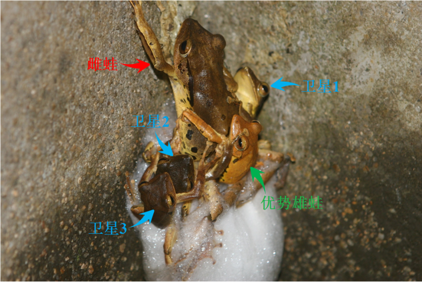不堪重负的雌蛙身上扒着1只优势雄蛙和3只“卫星”雄蛙