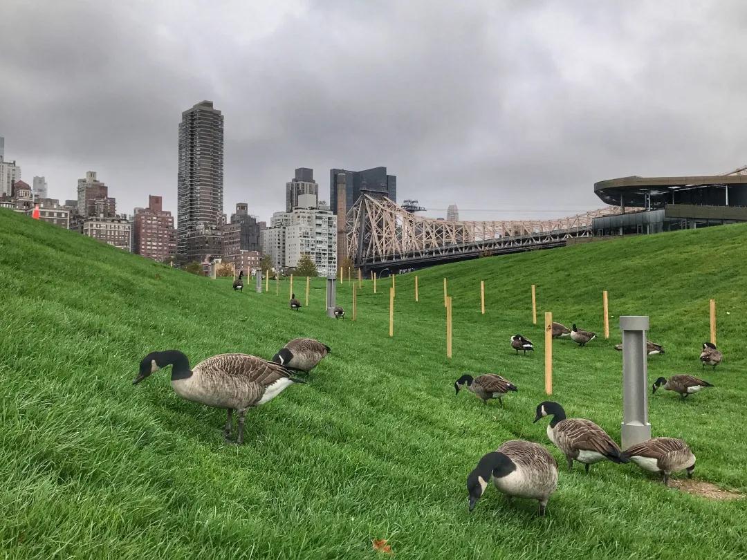 几年前我去纽约时,就曾目睹了罗斯福岛上成群的加拿大雁在绿地上悠哉悠哉啃草。它们所到之处,绿地旁的人行步道上都留下了“雷”,一不留神就可能一脚踩上鸟屎。