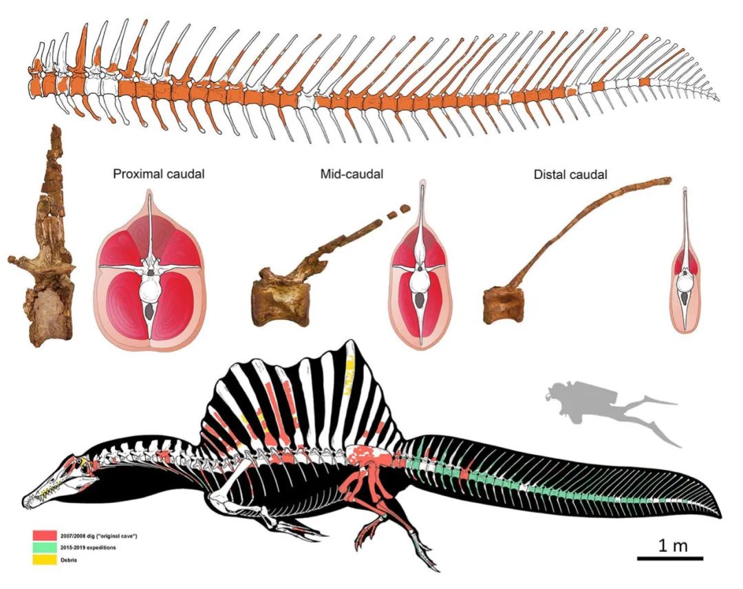 新的化石是一列非常完整的棘龙尾椎,在尾椎上方也有延长的神经棘,这说明棘龙具有一条形状侧扁,带有尾鳍的大尾巴。