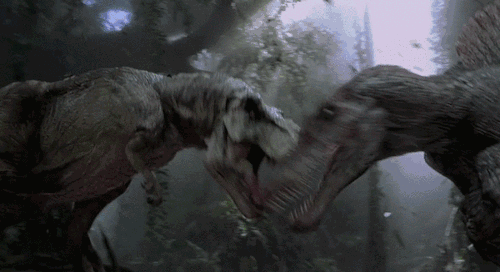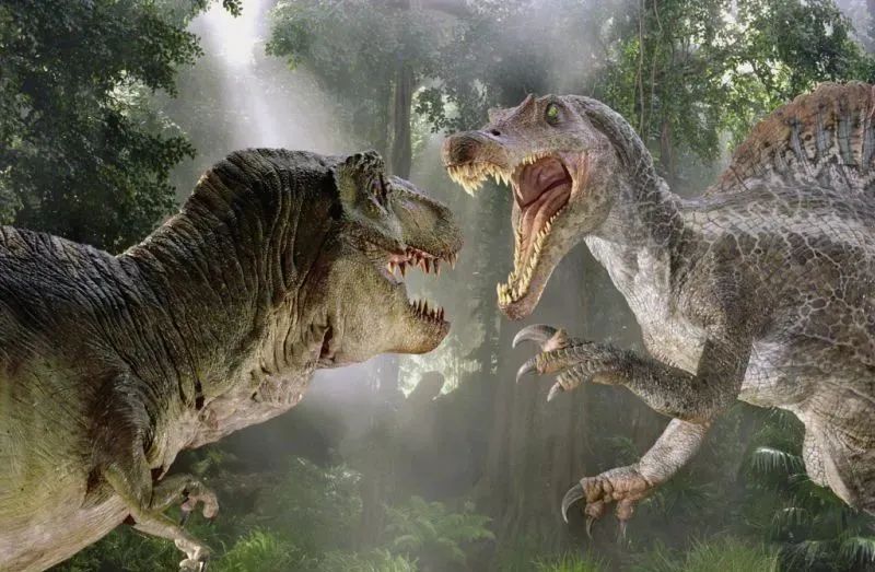 在这部电影中,棘龙被描绘成超越霸王龙的凶残猛兽,甚至在一次打斗中拧断了霸王龙的脖子。电影中的霸王龙和棘龙之战