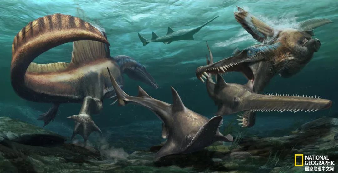 生活在水中的棘龙的生态复原图|来源:国家地理中文网